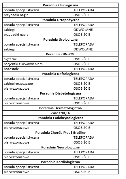 W związku z zagrożeniem epidemicznym, w trosce o bezpieczeństwo Pacjentów wprowadzamy ograniczenia w bezpośrednim przyjmowaniu Pacjentów w Poradniach Specjalistycznych. Wprowadzamy alternatywna formą wizyty tj. tzw. TELEPORADĘ. Pacjenci będą przyjmowani zgodnie z poniższą tabelą: