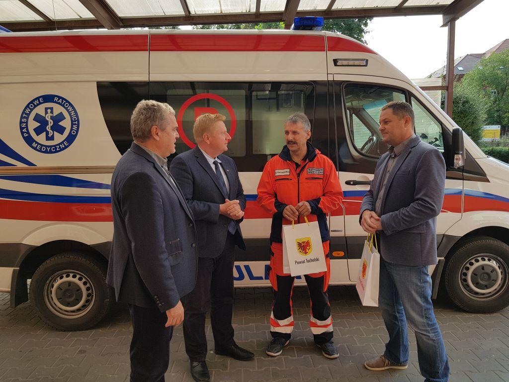 Nasze karetki wyposażone zostały w nowe zewnętrzne nadajniki GPS. Sprzęt został zakupiony przez Starostwo Powiatowe. Na zdjęciu moment przekazania prezentu przez Pana Michała Mroza - Starostę Tucholskiego i Pana Zenona Paturalskiego - Wicestarostę na ręce koordynatora naszych zespołów RTM i Prezesa firmy Therapeutica Pana Tomasza Ossowskiego.