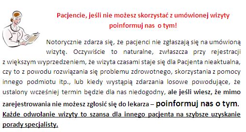 W dniach 31-05-2017 - 01-07-2017 lek. med. M. Śniegowski nie będzie przyjmował z powodu urlopu.