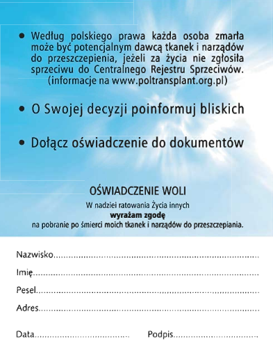 Niezależnie od przepisów, możemy sami, za życia wyrazić wolę przekazania po naszej śmierci naszych organów chorym potrzebującym przeszczepu.