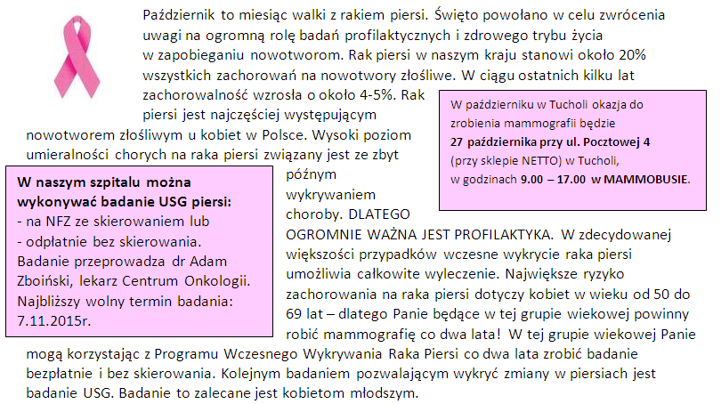 W dniach od 9 do 13 listopada br. na terenie parkingu Urzędu  Miejskiego w Tucholi (Plac Zamkowy 1), odbędą się bezpłatne badania  mammograficzne i cytologiczne dla kobiet: