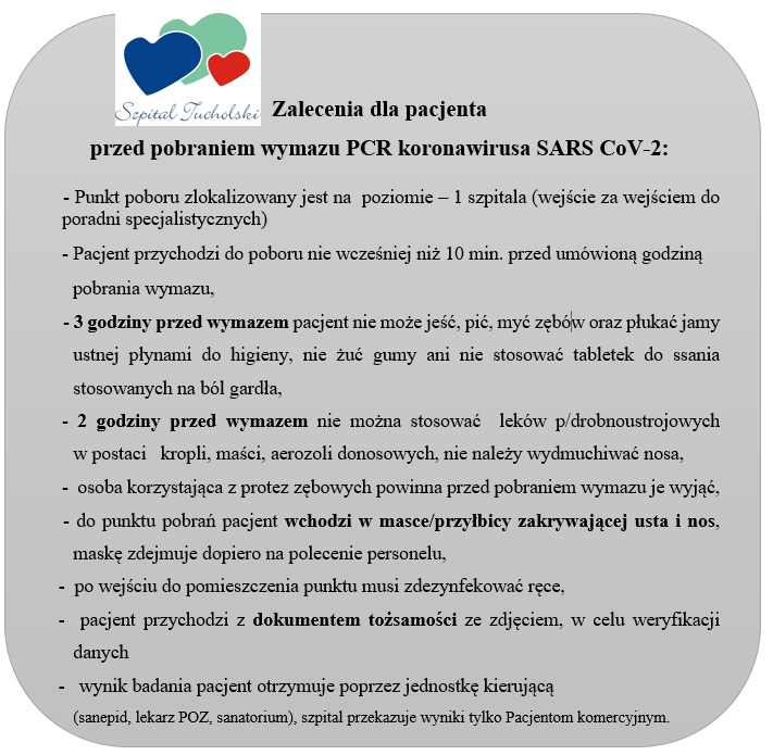 1. Punkt pobrań wymazów PCR koronawirusa SARS CoV-2 (zlokalizowany na poziomie -1, wejście za wejściem do poradni specjalistycznych) jest czynny od 700 do 1130: