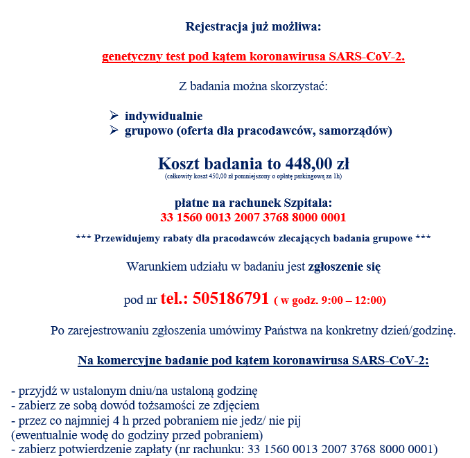 Od przyszłego tygodnia planowane jest wznowienie ambulatoryjnych badań diagnostycznych w naszym szpitalu. Mamy nadzieję, że możliwe będzie uruchomienie wszystkich pracowni diagnostycznych. Szczegóły wkrótce.