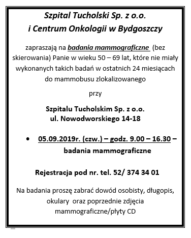 Od dn. 04.09.2019r. w „Szpitalu Tucholskim” funkcjonować będzie jedna wspólna rejestracja do wszystkich poradni specjalistyczna zlokalizowana na parterze szpitala, w miejscu gdzie dotąd funkcjonowała rejestracja do (m.in.) poradni chirurgicznej.