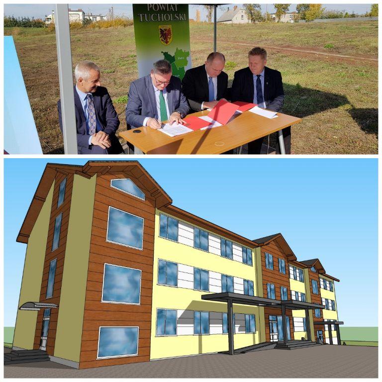 We wtorek 16 października Prezes Zarządu „Szpitala Tucholskiego” wraz z Marszałkiem Kujawsko – Pomorskim w towarzystwie przedstawicieli władz samorządowych i pracowników szpitala podpisali umowę o dofinansowanie projektu „Budowa Zakładu Opiekuńczo – Leczniczego”. Przewidziana wartość całkowita projektu, który oprócz powstania nowego ZO-Lu przewiduje także utworzenie w nowym budynku Zakładu Rehabilitacji i Domu Dziennej Opieki Medycznej, wynosi ok 11,11 mln zł. Koszt samego zakładu opieki długoterminowej ma wynieść ok 5,7 mln z czego ok 4,8 pochodzić ma ze środków unijnych.