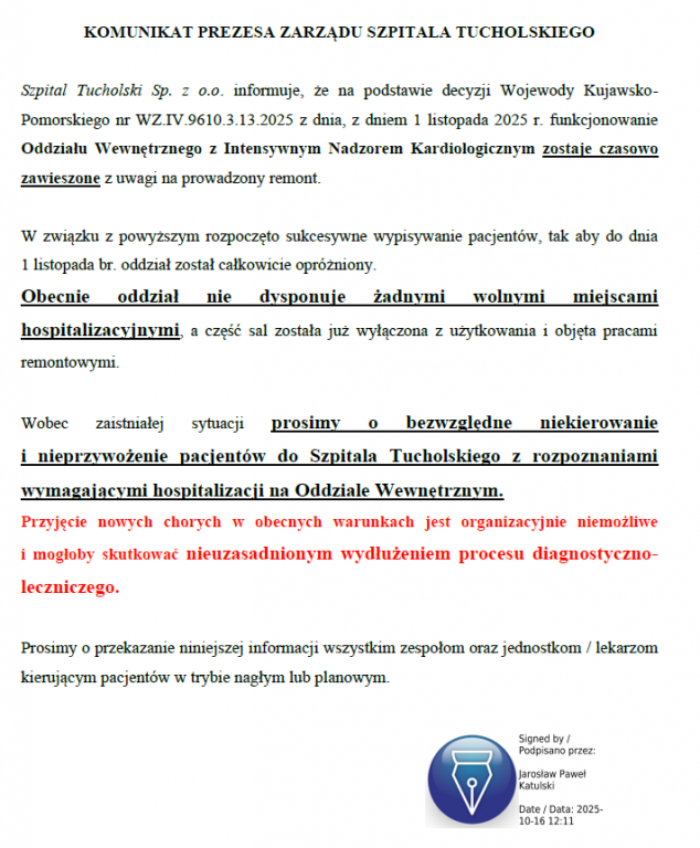 Szpital Tucholski Sp. z o.o. informuje, że na podstawie decyzji Wojewody Kujawsko-Pomorskiego nr WZ.IV.9610.3.13.2025 z dniem 1 listopada 2025 r. funkcjonowanie Oddziału Wewnętrznego z Intensywnym Nadzorem Kardiologicznym zostaje czasowo zawieszone.