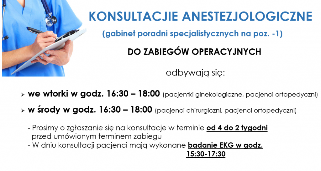 Od dnia 1. września anulowane zostają poniedziałkowe konsultacje anestezjologiczne. Pacjentów przed zabiegami ortopedycznymi prosimy o zgłaszanie się we wtorki lub środy.