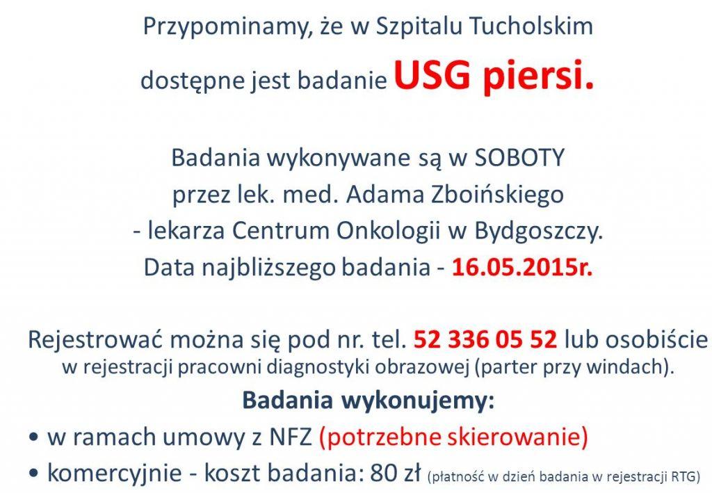 Paniom przypominamy, że w Szpitalu Tucholskim znów można robić USG piersi. Najbliższy termin: sobota, 13.06.2015 (informacje pod nr. tel. 52 336 552).
